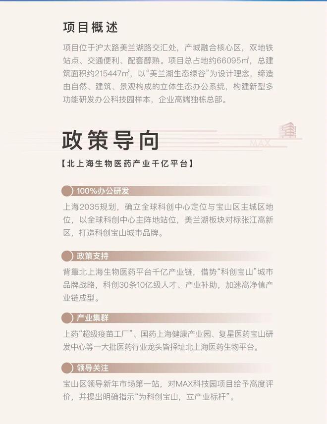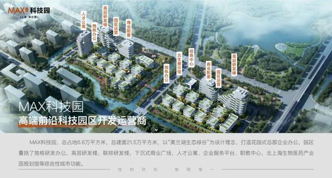 MAX科技园(宝山·美兰湖)项目将打造成宝山的科创新标杆,主要从事总部研发生物医药产业,C65科研用地,可环评,可通燃气,全上海双湖景观科技园区。独立入户设计,首层私属花园、270°采光、层层宽境露台、屋顶花园,立体生态办公。整个项目以美兰湖公园的绿色生态为设计理念,打造“美兰湖生态绿谷”,是“一企一栋”的总部独栋型产业项目。