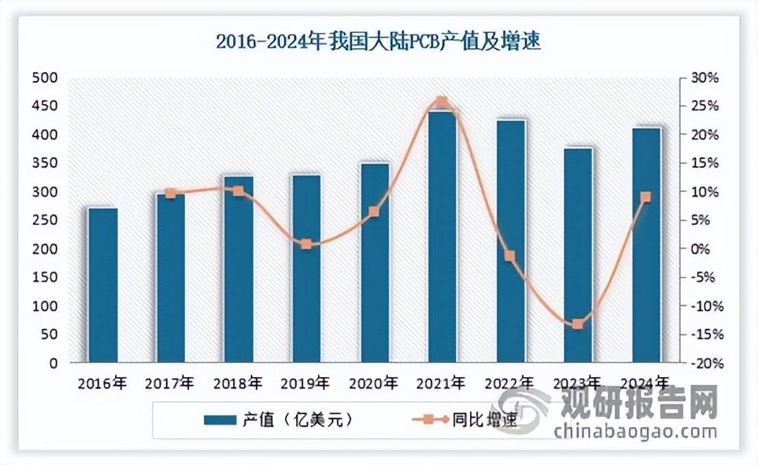 在此背景下,我国印制电路板(PCB)行业也重回温和增长周期,展现出较强的市场韧性。2024年,我国大陆PCB产值同比增长9%,达到412.13亿美元,占全球总产值的56%,稳居市场主导地位。
