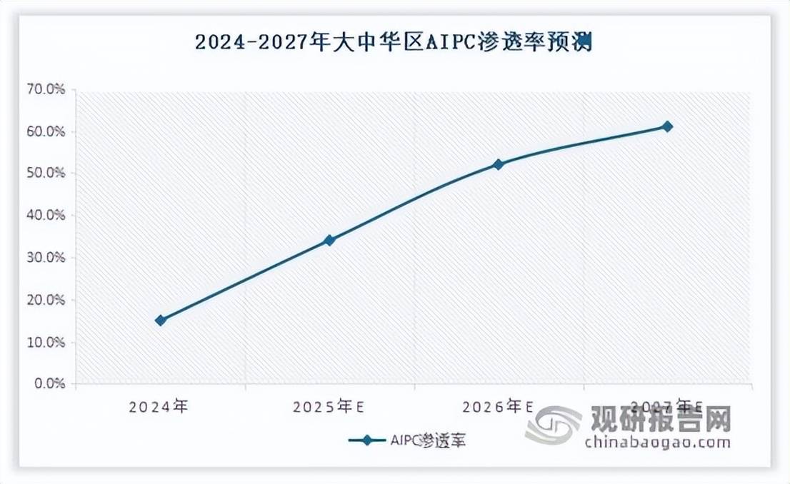 AIPC对印制电路板(PCB)的增量需求,核心在于本地运行AI任务需集成更强的NPU(神经网络处理器)。这驱动主板设计向更高集成度、更优散热性能和更小尺寸方向发展,同时对HDI(高密度互连)、类载板及散热基板等提出了更高要求。此类主板的平均售价也将显著高于传统PC主板。近年来,全球AIPC渗透率快速攀升。近年全球AIPC渗透率快速攀升。如2024年大中华区AIPC渗透率达15%,预计在2027年进一步升至61%。