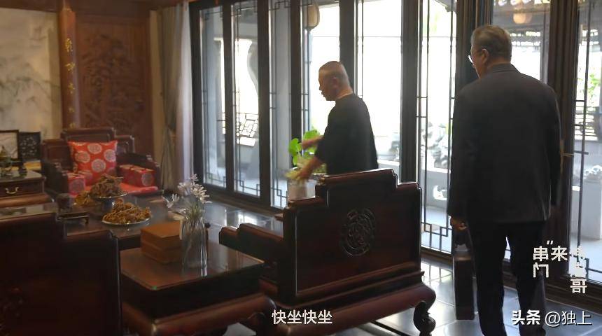 进入郭德纲家后,王伟忠跟随郭德纲走下楼梯,来到楼下的会客室。王伟忠原本以为会客室是地下室,没想到外面竟是一个典雅的中式庭院。庭院内陈设考究,满是红木家具,就连墙壁也是实木。二人坐在罗汉床上,场面略显古朴,仿佛穿越回了古代,给人一种别样的视觉冲击。